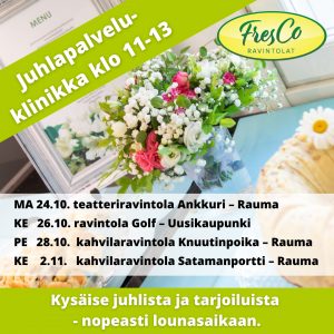 Juhlapalveluklinikka on auki lounasaikaan klo 11-13 ravintoloissamme Raumalla ja Uudessakaupungissa seuraavasti: